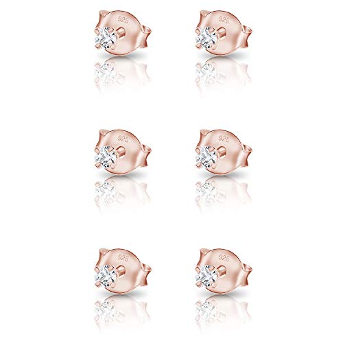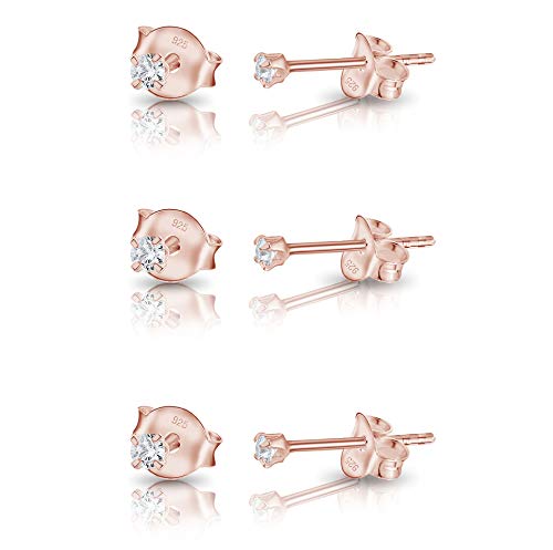 DTPsilver - 3 Paia di Orecchini a Perno Molto PICCOLI - Argento 925 Placcato in Oro Rosa con Zirconia Cubica Rotondi - Diametro 2 mm - Colore: Chiaro/Bianco CZ