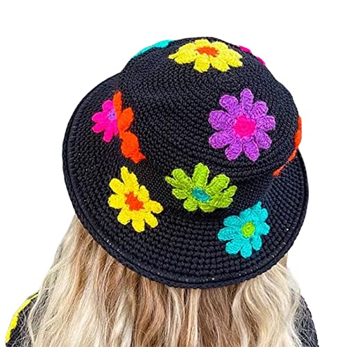 Dubute Cappello da pescatore lavorato a maglia da donna, con fiore all'uncinetto, tesa larga, protezione solare per esterni (nero, taglia unica)