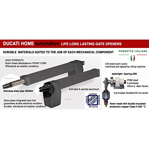 Pistoni telescopici, con corsa max 300mm. Modalità di funzionamento passo passo o con ri-chiusura automatica con tempo di pausa regolabile da 1 a 100 secondi.Possibilità di apertura pedonale ( apertura parziale di 1 sola anta per permettere il passaggio pedonale)