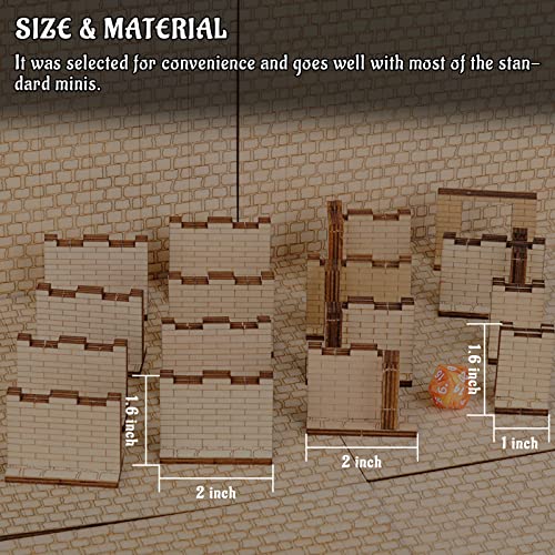 Dimensioni e materiale: tagliato al laser e inciso da compensato di betulla di alta qualità. Tutte le dimensioni della base delle piastrelle sono 5,1 x 2,5 cm e l'altezza della parete è di 36 mm. La parete è per giochi che supportano una scala di 28 mm. È stato selezionato per comodità e va bene con la maggior parte dei mini standard.