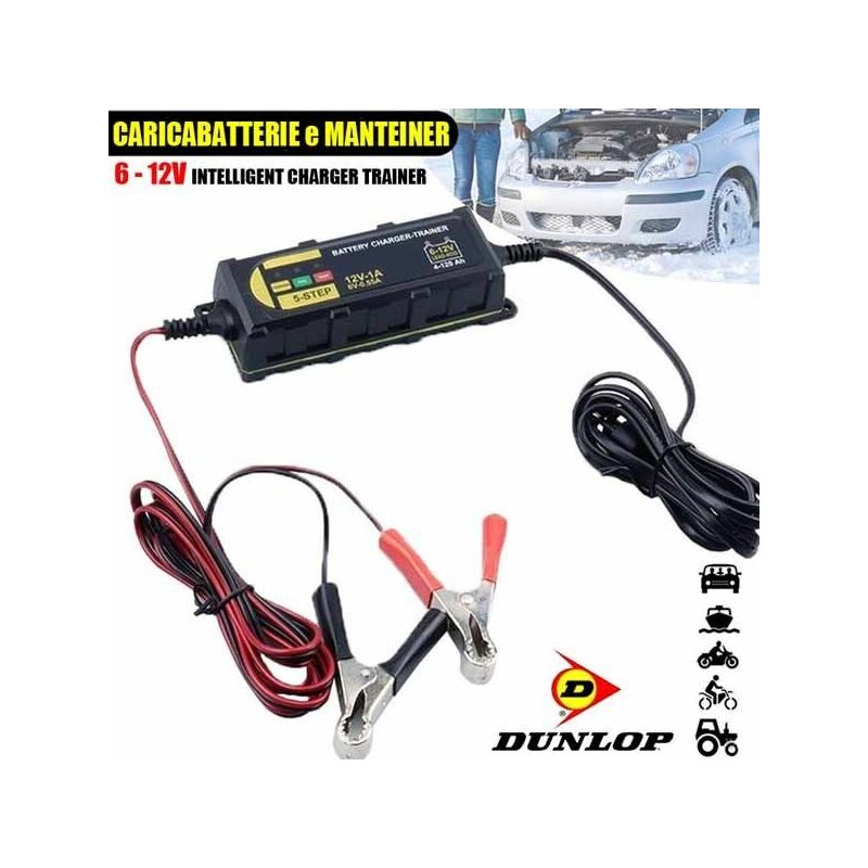 Vuoi ottenere il massimo dalla batteria della tua auto, barca, moto e vuoi che dopo una lunga pausa del tuo veicolo ci sia una brutta partenza? Oggi, offriamo la soluzione perfetta con questo caricabatterie intelligente DUNLOP. Mantenitore di carica per batterie, caricamento intelligente a 5 fasi per batterie al piombo e al gel da 6V - 12V, con sistema di protezione da scintille, cortocircuiti, surriscaldamento, e inversione di polarità. Il caricabatterie di mantenimento è alimentato da un microprocessore AD a 12 bit con un profilo di carica a 5 fasi per batterie di autoveicoli, motocicli, trattori, imbarcazioni, ecc... Il microprocessore registra la condizione della batteria e regola il controllo in modo che si ottenga il giusto flusso tra la batteria e la tensione corretta. Questo rende la batteria completamente carica e la massima durata estesa. Se la spia LED FULL si accende la batteria è completamente carica. Se la spina è scollegato, il caricabatterie si spegne. Il