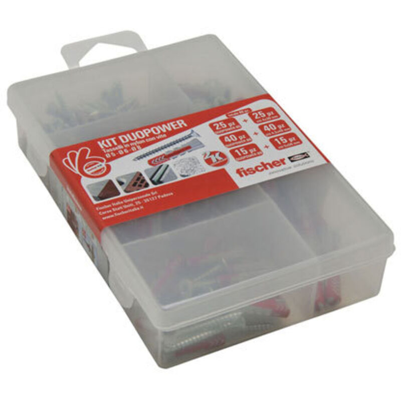 Fischer Duopower KIT Valigetta 80 Tasselli DUOPOWER con vite (160 Pezzi totali) Vantaggi: Due componenti per valori di carico più elevati e funzionamento intelligente (espansione, piegatura, annodamento) in funzione del materiale di supporto. Il miglior feedback possibile nel serraggio. E' possibile percepire con certezza quando il fissaggio è installato perfettamente. La ridotta lunghezza del fissaggio assicura un'installazione veloce senza forature profonde. Il collare sottile del fissaggio impedisce lo slittamento dentro al foro. Le alette anti-rotazione ravvicinate impediscono la rotazione nel foro durante l'installazione. Materiali di supporto: Calcestruzzo Mattone pieno in laterizio Mattone pieno in silicato di calcio Blocco pieno in calcestruzzo alleggerito Mattone semipieno (perforato verticalmente) in laterizio Mattone semipieno (perforato verticalmente) in silicato di calcio Blocco cavo in calcestruzzo alleggerito Calcestruzzo aerato autoclavato (calcestruzzo cellulare)