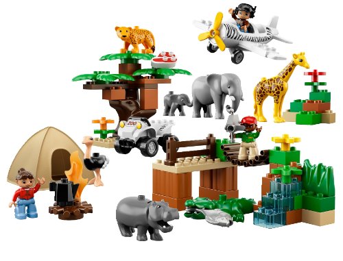 Contiene 8 animali DUPLO: 1 struzzo, 1 ippopotamo, 1 giraffa, 1 leopardo, 1 elefante, 1 cucciolo di elefante, 1 coccodrillo e 1 pesce.