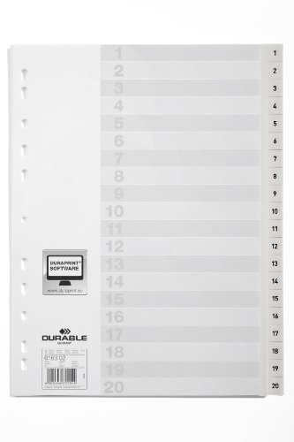 Durable 616302 - Divisorio con tasti prestampati 1-20, f.to A4 verticale, 20 tasti, copertina personalizzabile, foratura universale, bianco, 20 pezzi