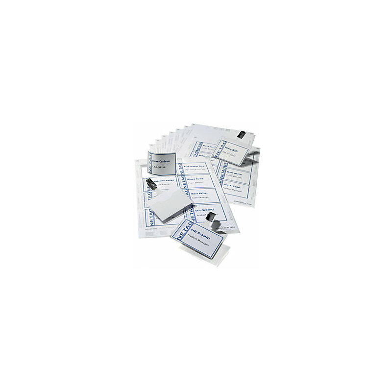 Set per targhette per nome, targhetta con clip, conf. da 3 pz. Fornitura = montato. Altezza = 60 mm. Larghezza = 90 mm. Materiale = plastica. Tipo di fissaggio = con clip. Colore = trasparente. Fornitura = in ogni set 20 cartellini per il nome, portacartellino EDV scrivibile UNI A4. Tipo di prodotto = badge con clip. Soluzioni complete per una realizzazione rapida e perfetta: i set per targhette per nome di DURABLE. Ogni set contiene 20 targhette per nome e portacartellini EDV scrivibili in cartone speciale di alta qualità in formato UNI A4 con microforatura. Adatto per tutte le stampanti a getto d'inchiostro, stampanti laser e fotocopiatrici. Una soluzione software gratuita con funzione di banca dati è disponibile all'indirizzo: www.duraprint.it. Conf. da 3 set