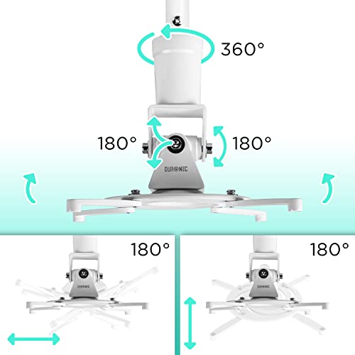Il supporto per proiettore Duronic è inclinabile dall'alto al basso a 90°, girevole a sinistra e destra di 40° e ruotabile di 360°. Una volta montato al soffitto la distanza con il proiettore è di 450mm estendibile fino a 700mm. Si prega di fare riferimento alla tabella per comprendere le differenze tra i vari modelli della nostra gamma.