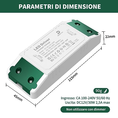 ✅[DUSKTEC TRASFORMATORE 220V 12V]: Tensione di ingresso: 100-240 V CA, 50/60 Hz // Tensione di uscita: tensione costante 12 V CC 2,5 A // Max. potenza 30 watt (si consiglia di rimanere ~20% al di sotto del carico massimo) // Non dimmerabile (non utilizzare su dimmer!) Protezione antincendio integrata.