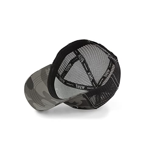 Trovate un berretto da baseball Von Dutch militare grigio e nero con grafica fashion modello Cam Silver, cappello mimetico uomo e donna ricamato Von Dutch grigio argento stile calligrafia originale, visiera curva armata, rete nera trapuntata grigia.