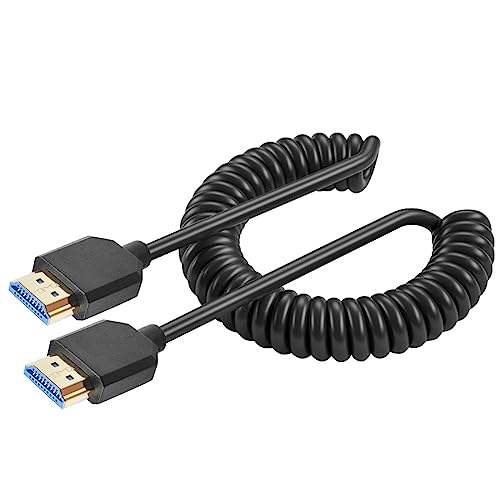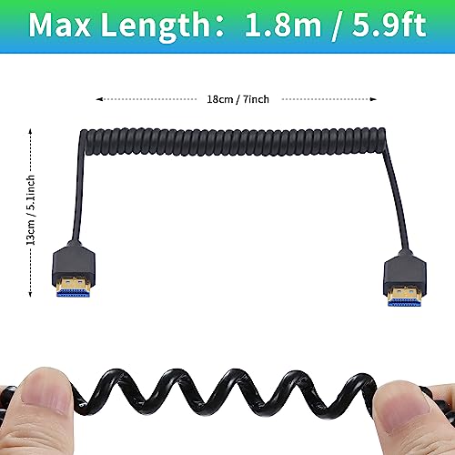Il HDMI 2.1 Cable Ultra Sottile a Spirale (OD: 4.0mm): Il nostro cavo HDMI 8K a spirale è realizzato con materiali di alta qualità, inclusa una resistente conchiglia in lega di alluminio e un design anti-piega all'estremità. La parte del connettore presenta un rivestimento in oro 24K per una trasmissione ad alta velocità con minima perdita di segnale.