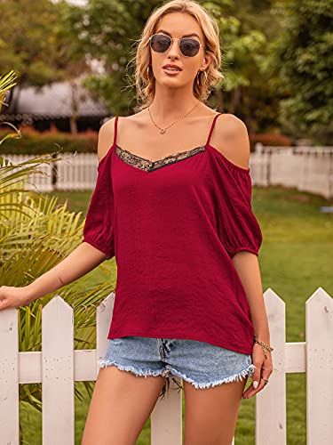 DUTUT Donna Estate Manica Corta con Spalle Scoperte Top Pizzo Top Senza Maniche Canottiere per Donna Casual T-Shirt(Rosso Vivo, S)