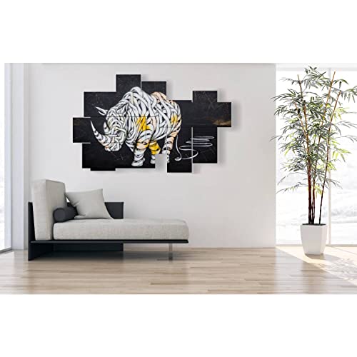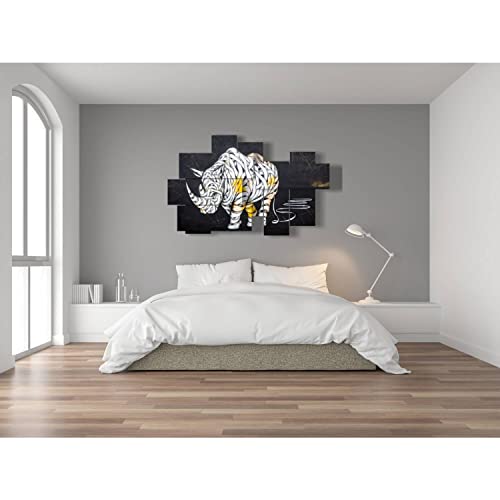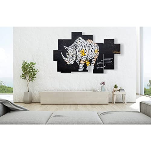 quadri astratti animali rinoceronte bendato é un quadro moderno tridimensionale composto da 9 pannelli. Dimensione totale (LxHxS): 185cm x 115 cm x 5.6 cm. (5 verticali 4 orizzontali)