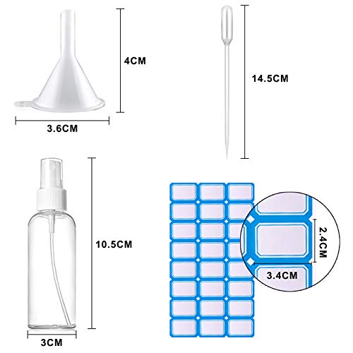 Comodo da usare: disponibile in 4 pezzi imbuto che rendono facile trasferire i liquidi necessari e ridurre gli sprechi. 4 pezzi contagocce sono ideali per controllare o miscelare i liquidi, le etichette sono utili per distinguere il contenuto in ogni flacone spray e la bella borsa trasparente con cerniera può aiutarti a sistemare i tuoi flaconi spray