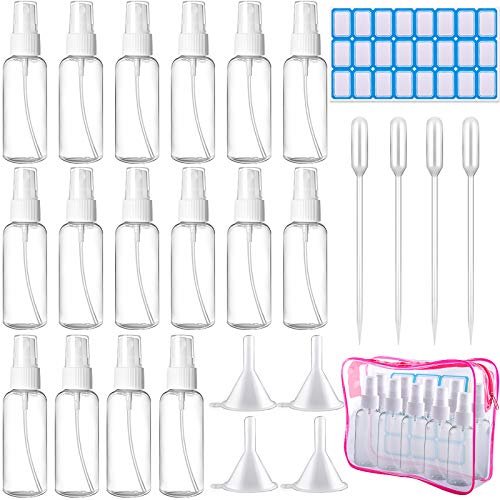 Pratico set di bottiglie da viaggio - disponibile in 16 flaconi spray vuoti da 50 ml, 4 imbutti, 4 contagocce e 24 etichette con una borsa rosa trasparente con cerniera per raccogliere e trasportare, ideale per i viaggi
