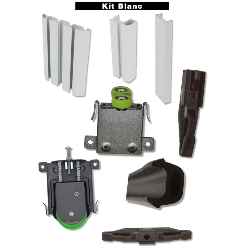 Dettagli: Kit di composizione per foglie Dotazione: 4 x maniglie 1 x fascia 1 binario 2 x profili a U 1 x guarnizione a vite 4 x guarnizione ammortizzatore 2 x sacchetti di 2 ruote 2 sacchetti di 2 guide superiori 1 x sacchetto di 4 fermi di fine corsa Bianco