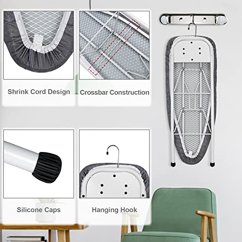 Poggia ferro unico: piastra metallica solida Il poggia ferro è un design speciale, più in basso rispetto all'area di ferro, assicurati che sia più sicuro e stabile quando posizioni il ferro.E puoi usare la tavola posteriore per stirare, allo stesso tempo hai posto per riposare il ferro con protezioni al silicone resistenti al calore su di esso.