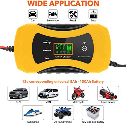 [COMPATIBILITÀ] Questo caricabatterie automatico è progettato per batterie 12V AGM, GEL, SLA e Flooded (WET), a ciclo profondo di tipo calcio o marine 5.0Ah-150Ah 12V. è un'ottima scelta per auto, camion (piccoli), moto, tosaerba, tricicli, veicoli elettrici, veicoli agricoli, fuoristrada, camioncini, barche, yacht, motoscafi.