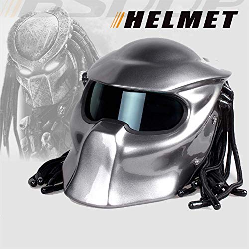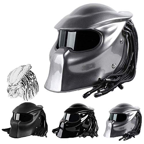 DYM258 Casco da Motociclista predatore Integrale Casco Jagged Warrior DOT Certificazione di Sicurezza Moto Riding Harley Retro Scorpion Mask Cross-Country con Treccia e LED Light,Argento,XL61~62CM