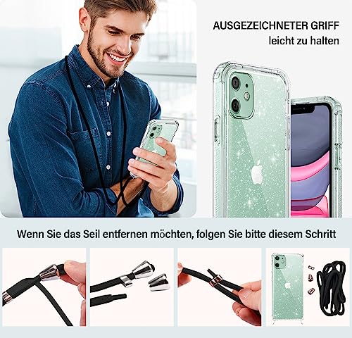 E-Lush Cover Glitter per iPhone 11 con Protezione Schermo, Trasparente Custodia con Cordino per iPhone 11 6.1", Rosyhulle Morbido Silicone TPU Gel 360 Gradi Antiurto Protettiva Case con Collana Nero