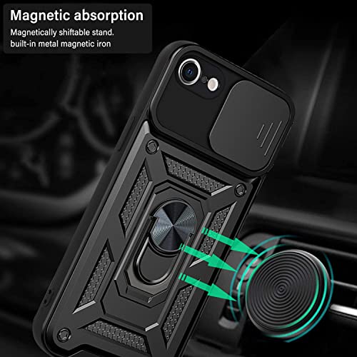E-Lush Cover per iPhone 7/ iPhone 8, Custodia con Scorrevole Protezione Fotocamera per iPhone SE 2020/ SE 2022 Supporto Magnetica Anello Rotante Difesa Militare Hard PC e TPU Bumper Case Nero