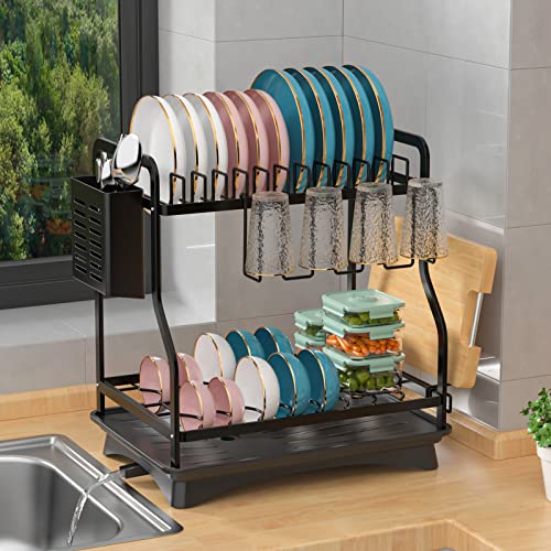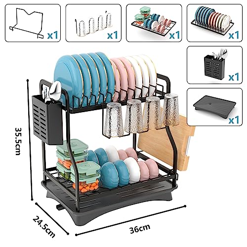 E-MANIS Scolapiatti da Lavello in Acciaio Inox,2 Livelli Sgocciolatoio per Piani con Drenaggio,Scolapiatti da Appoggio con Portautensili e Portabicchieri per Piatto,Tazza,Tagliere