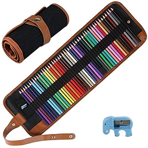 E-More, set di 50 matite colorate da disegno artistico con custodia in tela arrotolabile e temperamatite, per schizzi e disegni
