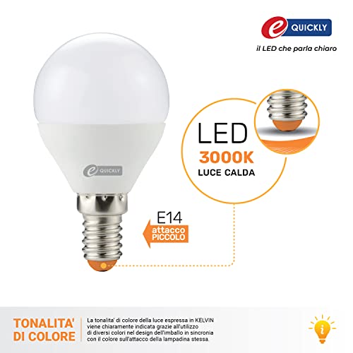 E-QUICKLY - Lampadina LED, attacco E14, 7,5W (Equivalenti a 50W), 680 Lumen, Luce bianca calda 3000K, Massima efficienza e Risparmio Energetico, forma P45 sfera - Pacco da 10 PZ