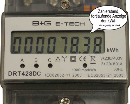 B+G E-Tech DRT428DC - Contatore digitale per la corrente, per barra DIN, con visualizzazione Watt, 3 x 230/400 V, 20 (80) A