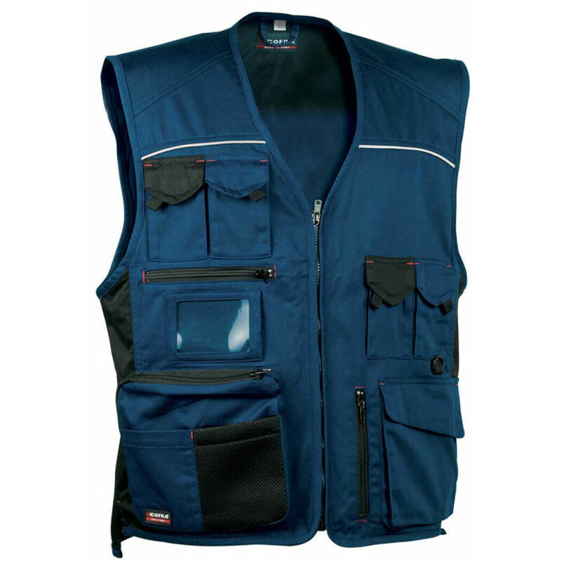 Cofra gilet expert blu navy nero taglia 60 1 tasca posteriore, 2 tasche anteriori grandi di cui una con chiusura zip, 2 tasche frontali, 3 tasche con chiusura zip, 4 tasche con apertura laterale in vita e porta carte. composizione 60% cotone 40% poliestere. grammatura 245g/m2