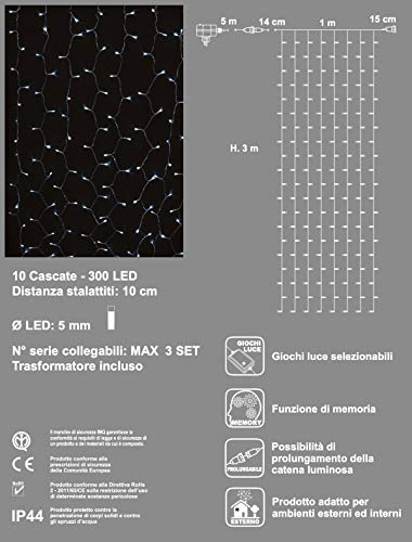 Eacommerce Tenda Cascata Luminosa Luci Natale 300 LED Bianco Caldo e Freddo 300x100 cm con Giochi di luce Memory IP44 (Bianco Caldo)