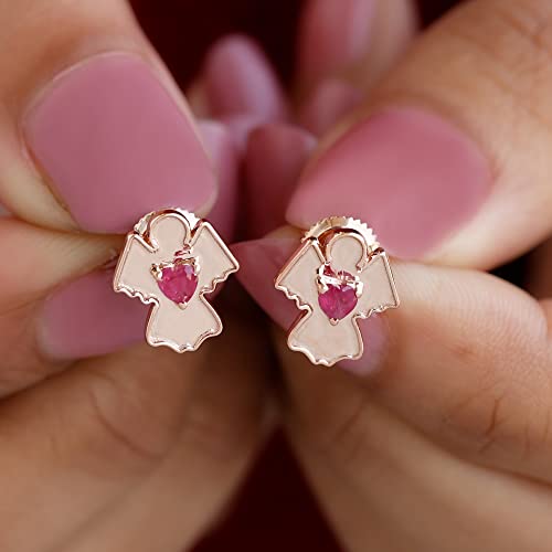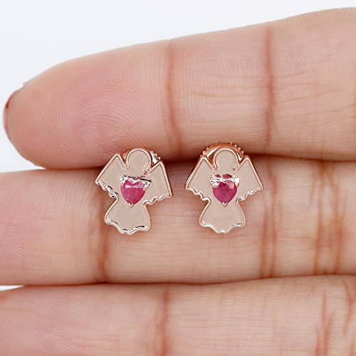 3/4 CT Ruby Stud Earrings, Gold Angel Earrings (3 MM Heart Shaped Ruby), Rose Gold, Screw Back, Pair