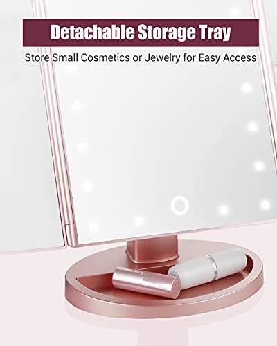 Easehold Specchio per Trucco Ingradimento 1X / 2X / 3X, Specchio Triplicare Pieghevole a Tre Facce, Specchio Illuminato con 21 LED USB 180 Gradi Girevole, Ideale per Viaggio, Lavoro, Trucco, Rasatura, Colore Oro rosa