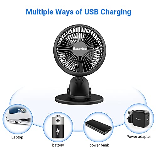 EasyAcc Ventilatore Clip Portatile Ricaricabile Ventilatore da Tavolo USB 3-15 Ore di Utilizzo Potente Vento 4 Velocità Rotazione di 720° Ventola Scrivania per Casa Ufficio Letto Passeggino Tende