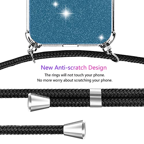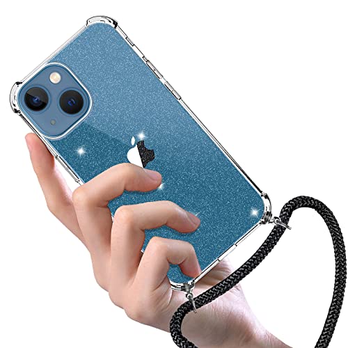 EasyBee Cover per iPhone 13, con Cordino Regolabile, Custodia Protettiva Ultra Sottile in Silicone con Protezione Fotocamera, Case in TPU Trasparente Antiurto con Glitter - Collana Nero