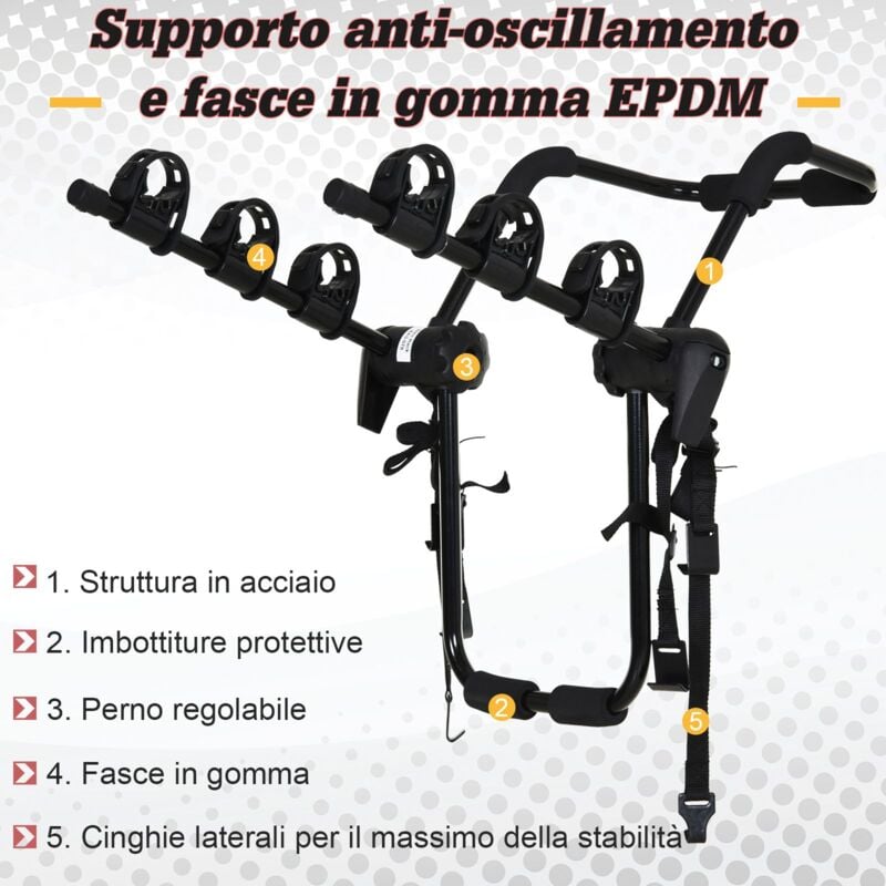 Vuoi portare la tua bicicletta in campeggio o in vacanza? Con questo portabiciclette puoi trasportare sulla tua macchina fino a 3 biciclette. La struttura è robusta, costruita in acciaio rifinito con materiale anticorrosivo ed è dotata di imbottiture in gomma per proteggere la tua auto. Puoi assicurare le biciclette usando le fasce in gomma presenti sul portapacchi e le funi in nylon. Finita la vacanza, piega la struttura e depositala in garage o in cantina. Pronta per la prossima avventura!Caratteristiche 6 fasce in gomma per caricare 3 comodamente 3 bici (per un massimo di 45 kg) Imbottiture protettive per proteggere la vernice della tua auto Compatibile con berline, monovolume, furgoncini e suv Design pieghevole e salvaspazio, puoi depositarlo comodamente in garage o in cantina dopo l'uso Struttura in acciaio al carbonio rifinito con materiale anticorrosione Funi in nylon di 2 diverse lunghezze per assicurare le biciDati tecnici Colore: Nero Materiale: Acciaio, PA, Gomma Carico