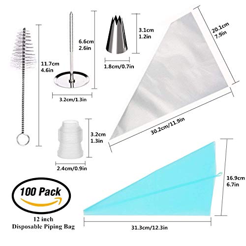 [142 pezzi del kit di decorazioni] 36 piccoli ugelli decorativi, 2 sacchetti decorativi riutilizzabili da 12 pollici, 2 raccordi in plastica riutilizzabili, 100 sacchetti decorativi usa e getta, 2 chiodi decorativi, 1 spazzola per la pulizia e 1 scatola.