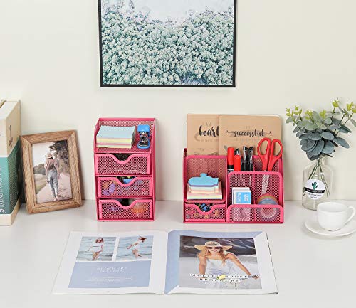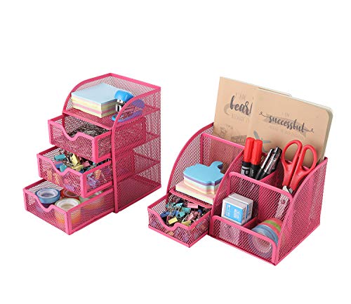EasyPAG - Organizer da scrivania in rete da ufficio, 2 pezzi, versatile da scrivania, porta cancelleria e 3 ripiani con cassettiera, colore: Rosa