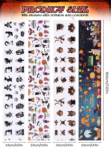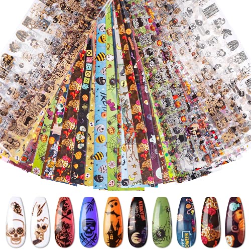 Quantità: 50 fogli/set adesivi per il trasferimento della lamina per unghie a tema Halloween, una varietà di stili di temi di Halloween classici e alla moda, modelli di zucca, pipistrello, fantasma, scheletro, ragno, teschio, strega e così via.
