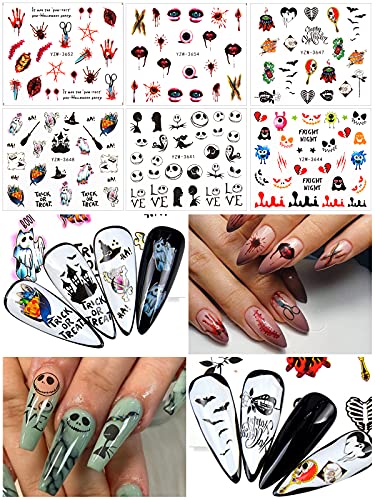 24 fogli di decalcomanie per unghie di Halloween:EBANKU Decalcomanie per adesivi per nail art con trasferimento dell'acqua di Halloween, inclusi modelli di teschio, mano di sangue, labbra, cicatrice, pipistrello, zucca, fantasma e altre opzioni fai-da-te.