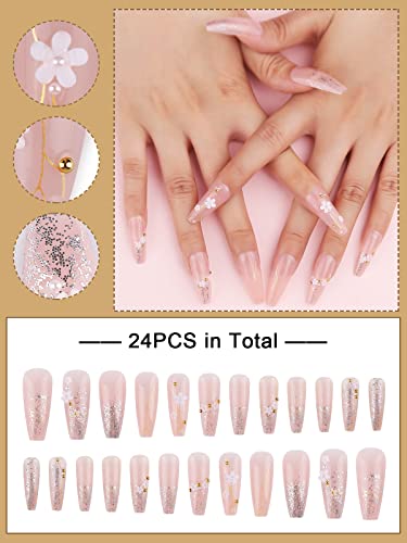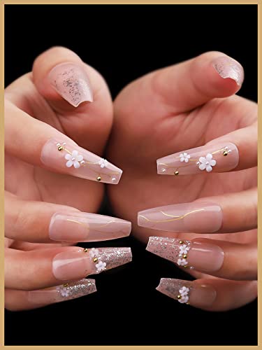 EBANKU 24 Pezzi Unghie Finte, Coffin French False Nails ballerina Press on Nail Bianco 3D con Perline Dorate Design Stick sulle Unghie per Donne e Ragazze Fai da Te
