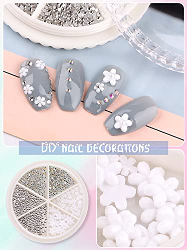【Set di strass per unghie con fiori】 Riceverai 6 scatole di ciondoli per nail art 3d, tra cui 4920 pezzi di perline di colore misto, fiori bianchi acrilici, perle, ecc. La miscela di diversi ciondoli per unghie rende più facile ottenere diversi design di nail art.