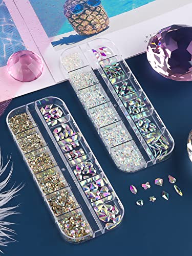 Kit di strass per unghie: 2 scatole di ciondoli in cristallo per unghie con 2 colori, ogni scatola ha cristalli rotondi in 6 dimensioni e altri strass in cristalli per unghie in 6 stili come stelle, lacrime, ovali, farfalle, a forma di cuore, ecc.