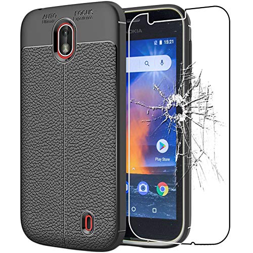 EbestStar - Cover Compatibile con Nokia Nokia 1 Custodia Protezione Silicone Gel TPU Morbida e Sottile con Pelle Design, Nero + Pellicola Vetro Temperato [Apparecchio: 133.6 x 67.8 x 9.5mm, 4.5'']