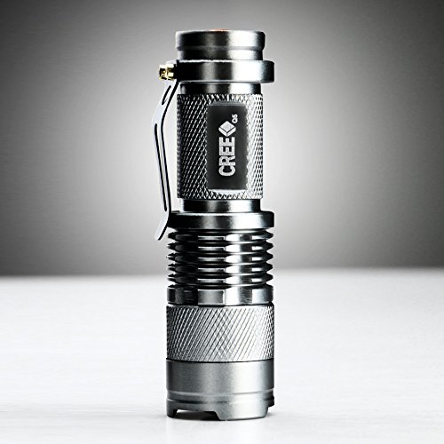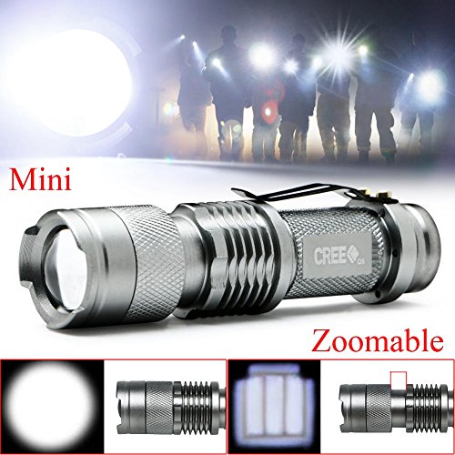 Ebilun - Mini torcia LED Q5, 1000 lumen, zoom regolabile, con batteria AA o 14500 (non inclusa) per campeggio, escursionismo, caccia, zaino in spalla, pesca, colore argento