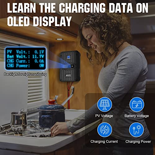 【Schermo OLED per il monitoraggio in tempo reale】 Dotato di schermo OLED, che può visualizzare lo stato di tensione PV, tensione della batteria, corrente di carica, potenza di ricarica e il pulsante può essere utilizzato per modificare le impostazioni del tipo di batteria.