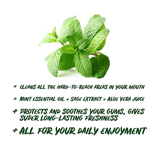 PRINCIPI ATTIVI: L'olio essenziale di menta assicura una freschezza estremamente duratura. L'estratto di salvia protegge le gengive ed è noto per le sue proprietà antibatteriche. Il succo di aloe vera ha un effetto lenitivo sulle gengive sensibili e irritate ed è spesso usato nei prodotti per l'igiene orale per aiutare a mantenere una mucosa orale sana.