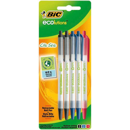 BIC ecolution Clic Stic Blister da 5 penne a sfera Noir/Blue/Rouge, 5 Pezzi