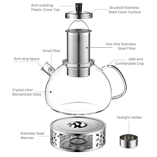Ecooe 2000mL Teiera di Vetro con Scalda Teiera, Teiera di Vetro con Rimovibile Filtro in Acciaio Inox