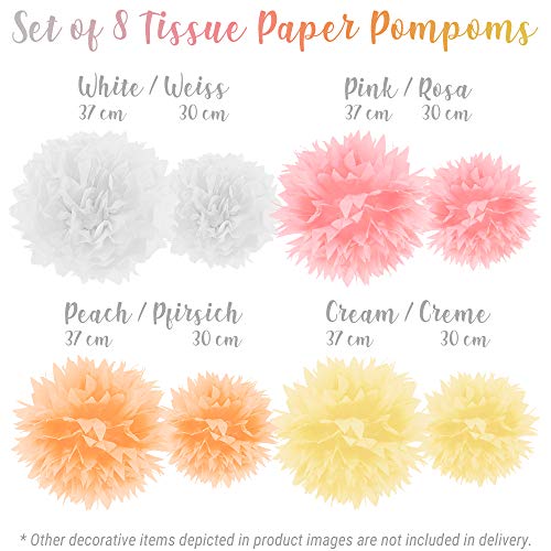 Cosa ottieni: Set di 8 Pom Pom di carta velina e il nostro servizio clienti cordiale.