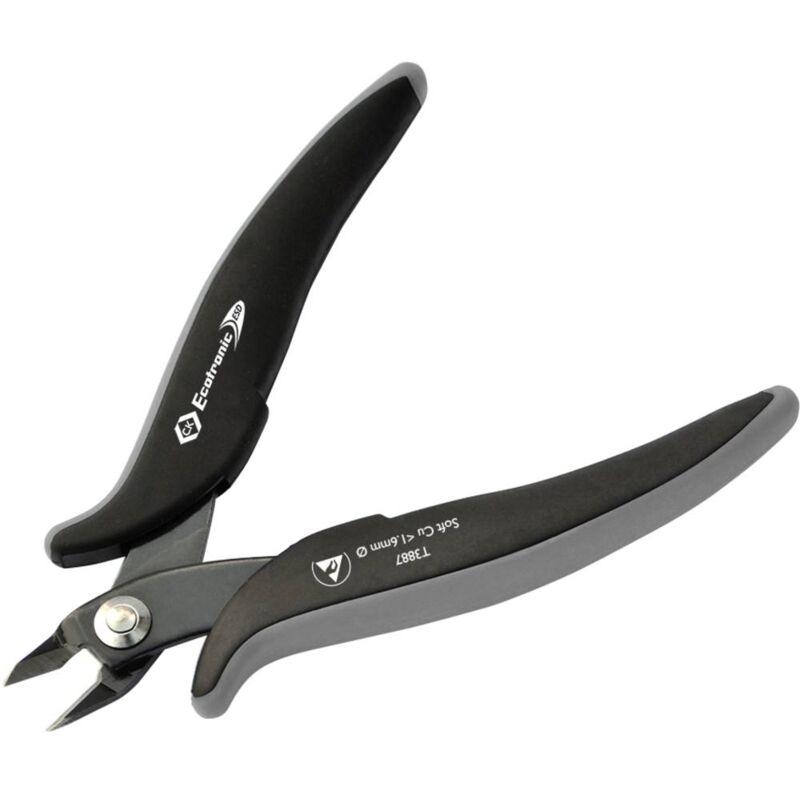 Dettagli tecnici Campo di impiego ESD Caratteristiche pinza senza sfaccettature Dimensione del prodotto, lunghezza 136 mm Materiale Acciaio al carbonio Proprietà del materiale brunito, altamente legato Tipo prodotto Tronchesino di precisione per elettronica Lunghezza lama: 10 mm Angolo di taglio: 21° Altezza testina: 21 mm Ampiezza della testa: 12 mm Tronchese con tagliente laterale C.K Ecotronic ESD Taglienti ad affilatura di precisione con un taglio completamente a filo Lama in acciaio speciale per utensili, temprata per prestazioni di taglio a lungo termine Manici a dispersione elettrostatica - dissipativi 10⁸ Manici bimateriale di forma sagomata per un lavoro confortevole Finitura brunita per resistenza contro la corrosione e riduzione della lucentezza Molla di richiamo ad azione fluida per praticità nei lavori ripetitivi Cerniera con rivetto in acciaio inossidabile duraturo Tronchese con tagliente laterale di precisione per applicazioni di taglio di precisione Adatto per il
