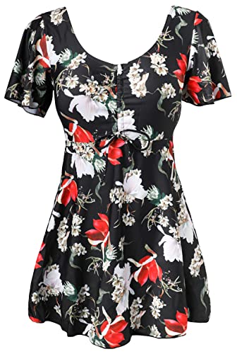 ECUPPER Costume da bagno intero da donna Plus Size Costume da bagno con coulisse stampa floreale increspato manica corta gonnata costume da bagno con pantaloncini, Giglio nero, 46-48